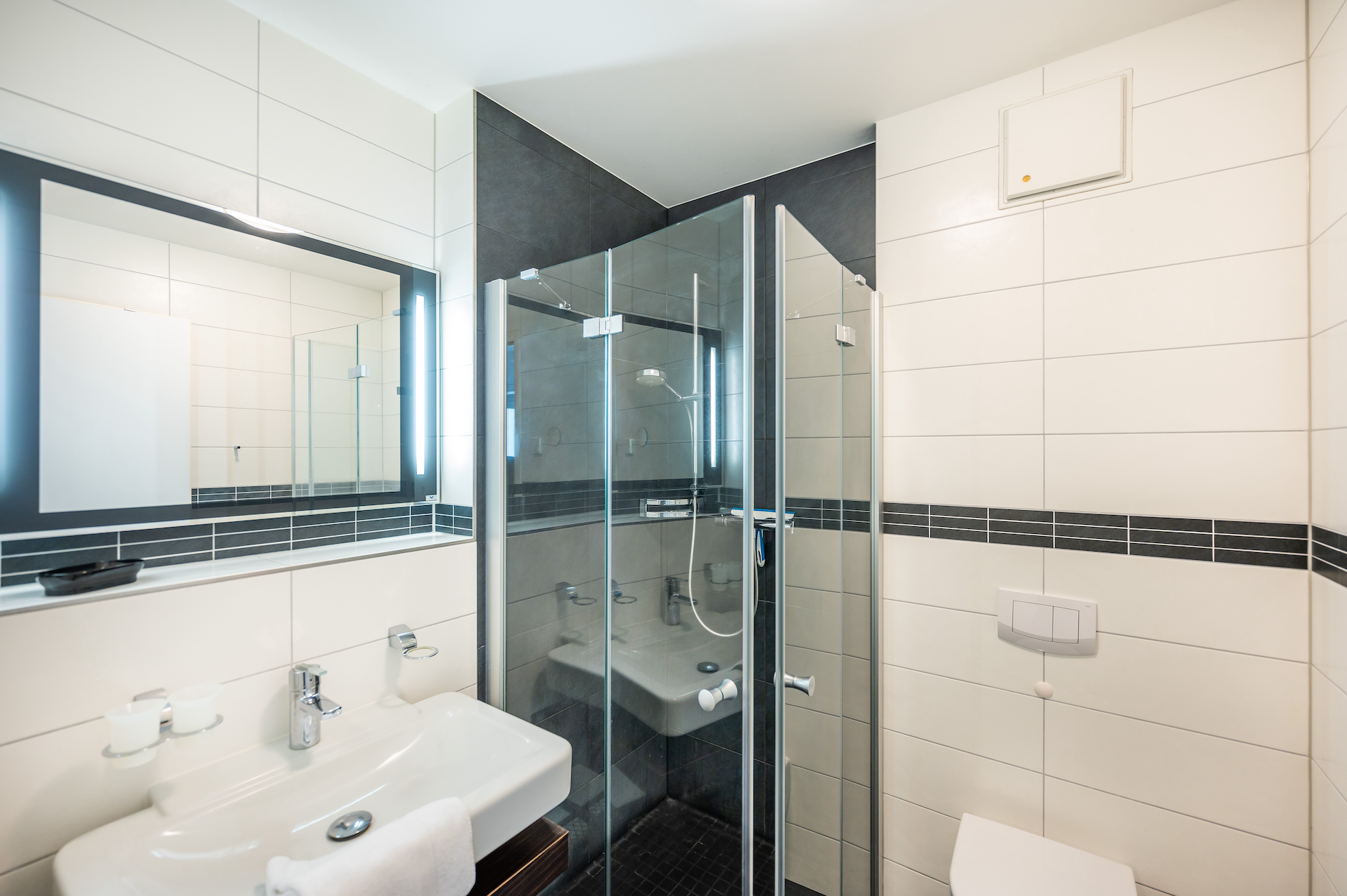 Bad: Duschbad in schwarz/ weiß gefliest mit bodenebene Ganzglasdusche, Waschbecken, WC, Fön