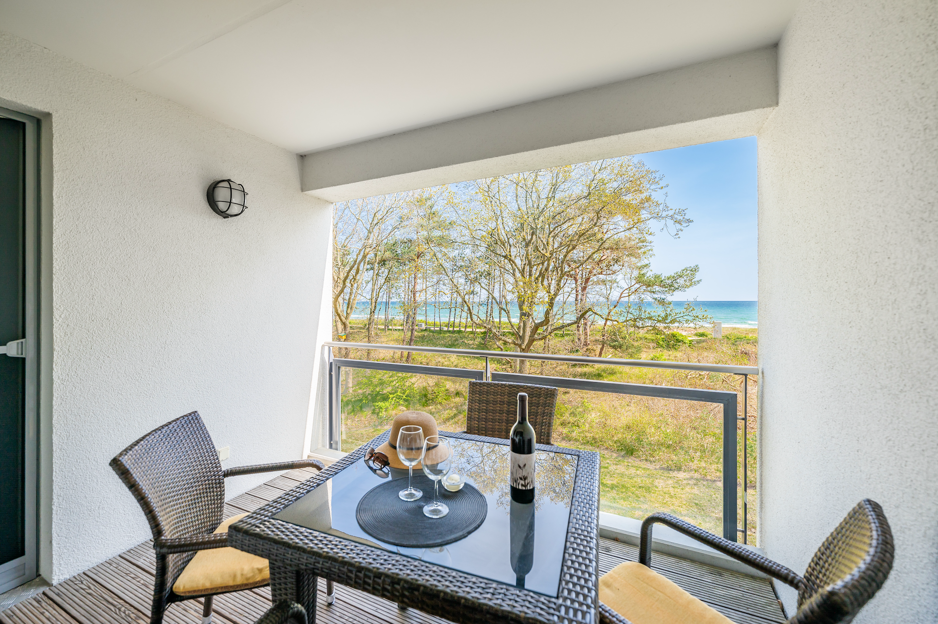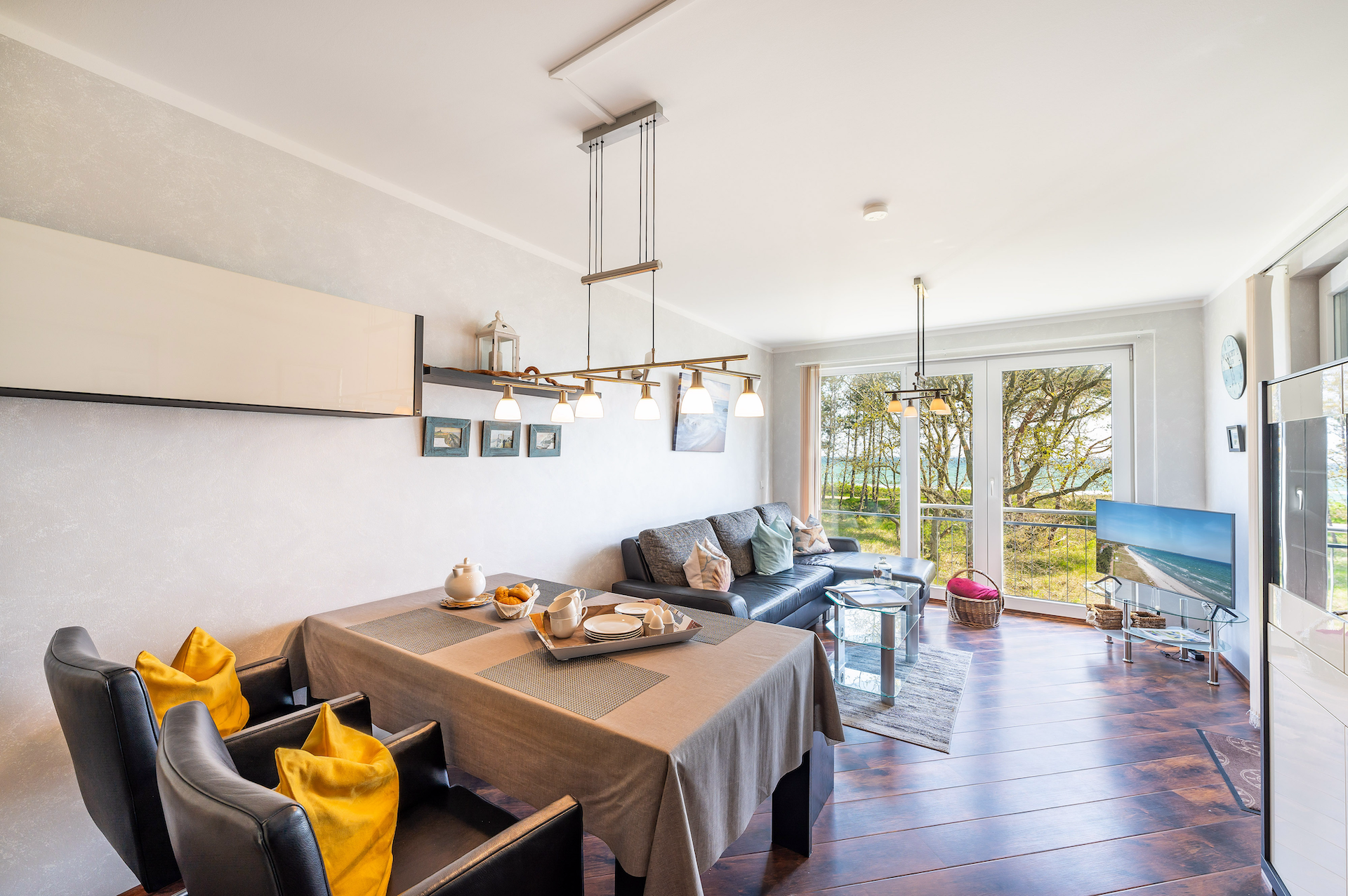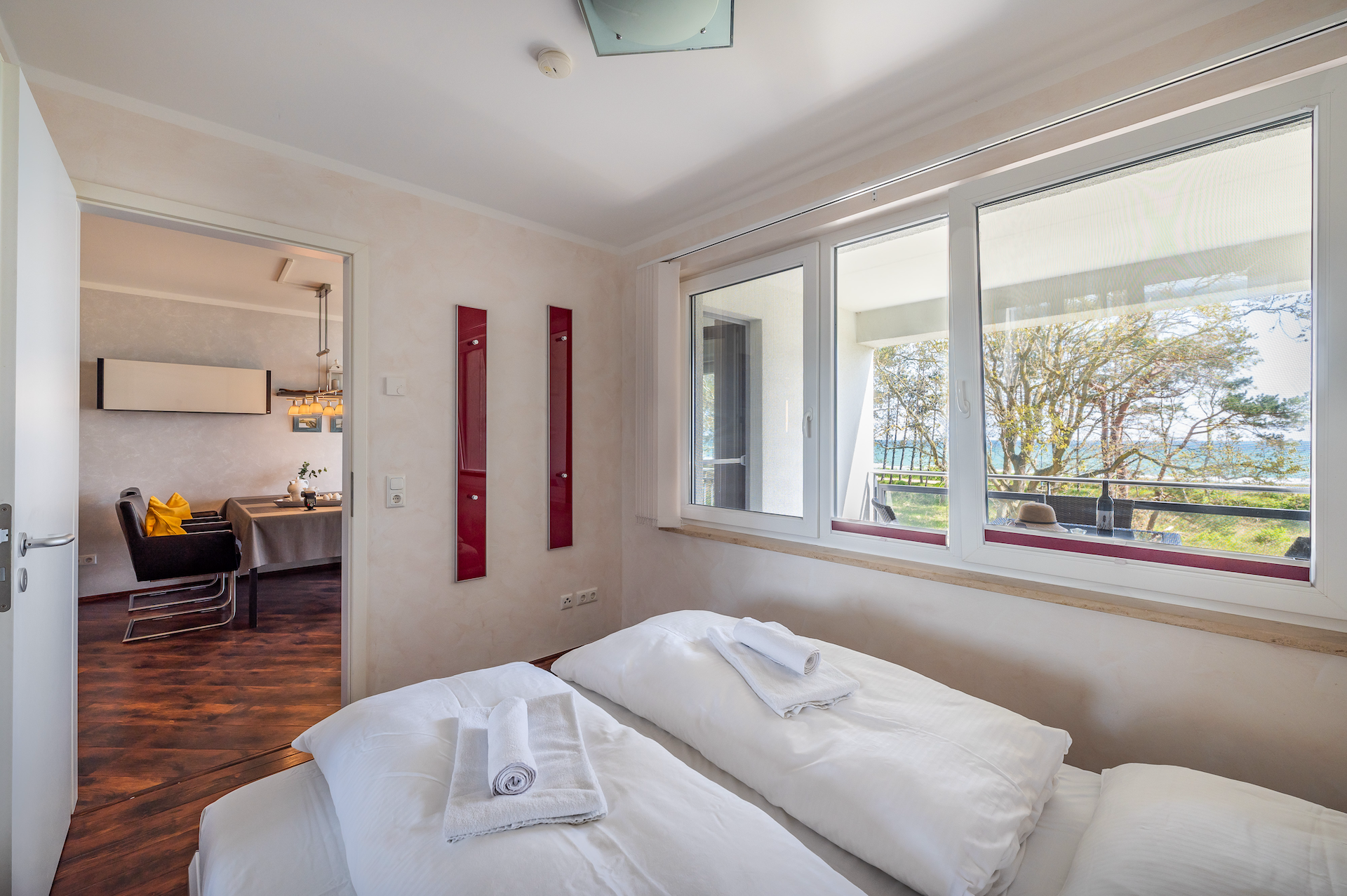 Durch die großen Panoramafenster können Sie die Meeresstimmung zu jeder Zeit genießen. Sowohl vom Wohnraum, wie auch vom Schlafzimmer blicken Sie auf die Dünen und das Meer. Zu einem der schönsten und längsten Strände von Rügen laufen Sie gerade einmal 50 m. Dort wartet auf Sie ein kilometerlanger weißer Sandstrand und klares Wasser.