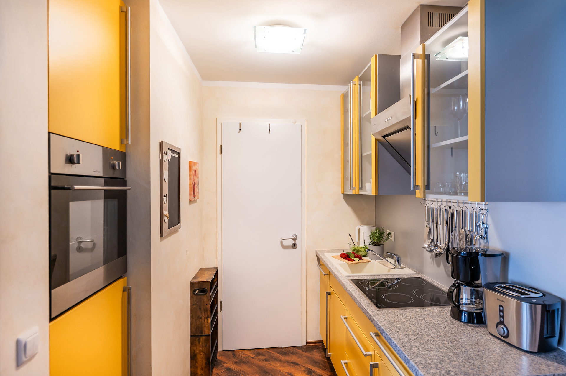Küche: Cerankochfeld, Backofen, Abzugshaube, Kaffeemaschine, Kühlschrank mit kleinem Gefrierfach, Wasserkocher, Toaster, Handrührgerät, Geschirrspülmaschine, Gläser, Geschirr, Besteck, Töpfe, Bügeleisen